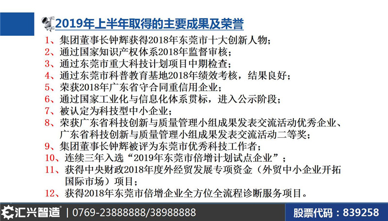 大會(huì)第五項(xiàng)議程知識(shí)產(chǎn)權(quán)部經(jīng)理蔣明華“年上半年取得的主要成果匯報(bào)”。實(shí)力見證榮耀,品質(zhì)鑄就輝煌。公司始終牢記“做受尊敬的好人、造受尊敬的產(chǎn)品、辦受尊敬的企業(yè)、建受尊敬的平臺(tái)”的企業(yè)使命,砥礪奮進(jìn),載譽(yù)而歸。這些榮譽(yù)既是對(duì)匯興智造年上半年成就的肯定,又是對(duì)未來發(fā)展的勉勵(lì)!