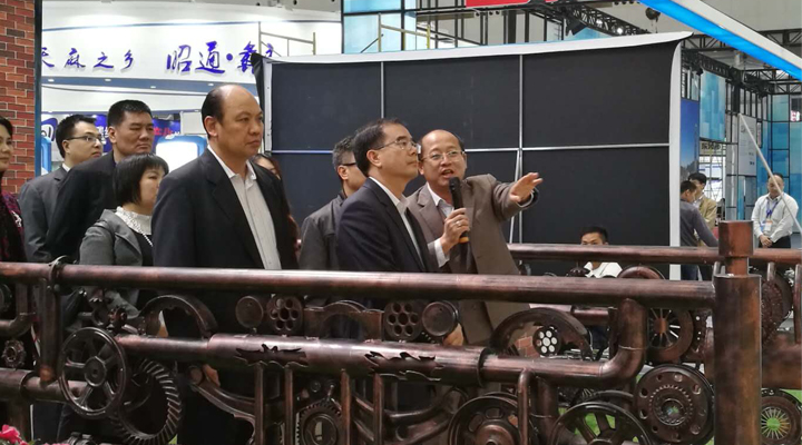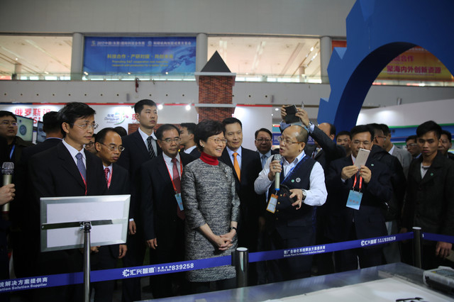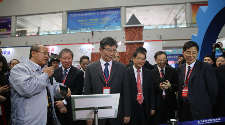 11時(shí)許 廣東省副省長(zhǎng)黃寧生、原科技部副部長(zhǎng)曹健林在東莞市領(lǐng)導(dǎo)的陪同下參觀德國(guó)館