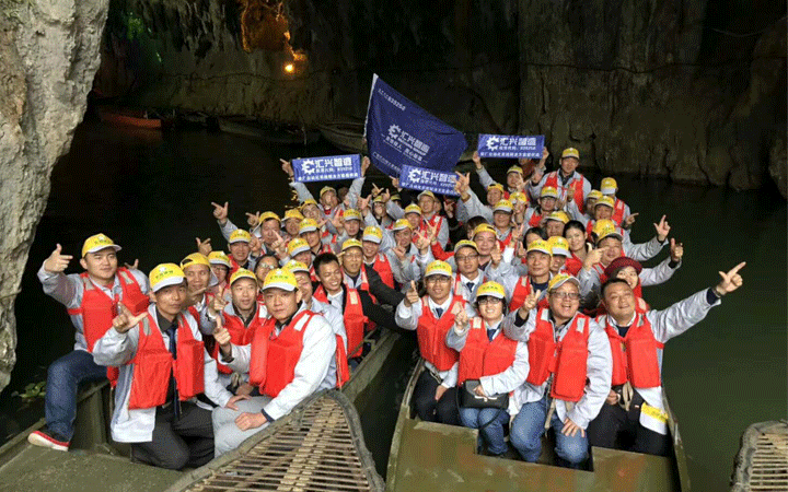 旅途第二站:仙橋地下河。仙橋地下河由兩段暗河和中間一段明河組成,自西向東,河面平靜。暗河內(nèi)鐘乳石、石灰?guī)r形態(tài)各異,有的像水母;有的像龍爪;有的像觀音;有的像關(guān)公,三分形象,七分想象,很是有趣,加上彩燈,地下河更是被妝點(diǎn)得美輪美奐。美好的事物總是能引發(fā)人類對(duì)美好未來(lái)的憧憬,“夢(mèng)想之旅”的團(tuán)隊(duì)成員們坐在船上,激情萬(wàn)分地大喊:“匯興智造是我們的船,而我們?cè)诖??!蔽覀儗P(yáng)帆啟航,來(lái)一場(chǎng)創(chuàng)世之旅,去尋找那屬于匯興人的桃源之地。
