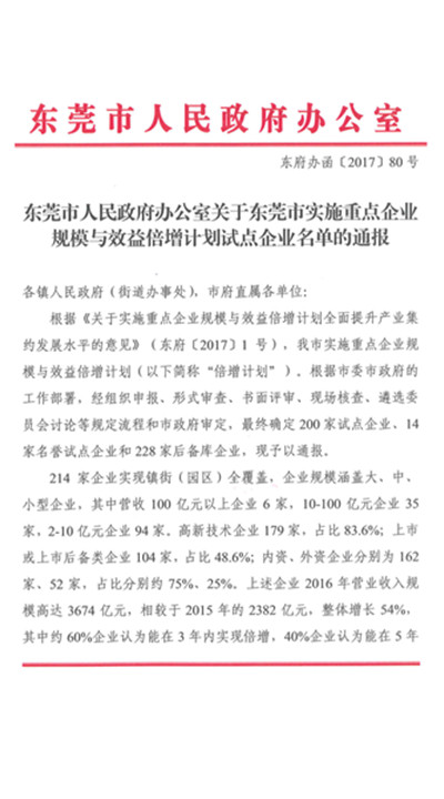 根據(jù)《關于實施重點企業(yè)規(guī)模與效益倍增計劃 全面提升產(chǎn)業(yè)集約發(fā)展水平的意見》(東府〔20171號),以及《關于東莞市實施重點企業(yè)規(guī)模與效益倍增計劃試點企業(yè)名單的通報》(東府辦函〔201780號),經(jīng)過前期的書面申報、形式審查、書面評審、現(xiàn)場核查、專家評審、材料審計等規(guī)定流程和市政府審定,廣東匯興精工智造股份有限公司(股票代碼:839258)憑借17年來在智能裝備領域的核心科技以及高成長性,成功入選為東莞市實施重點企業(yè)規(guī)模與效益倍增計劃(以下簡稱“倍增計劃”)200家試點企業(yè)之一。