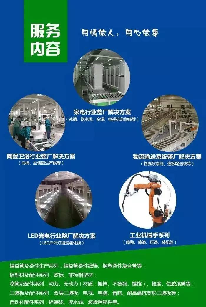 廣東匯興精工智造股份有限公司作為國(guó)家高新技術(shù)企業(yè),正逐步成為全球領(lǐng)先的整廠自動(dòng)化系統(tǒng)解決方案提供商,匯興智造家用電器、衛(wèi)浴陶瓷、新能源、LED、汽車零部件、家具廚具、物流輸送、精密電子電器、醫(yī)藥食品、包裝印刷等細(xì)分領(lǐng)域提供整廠自動(dòng)化系統(tǒng)解決方案及精密工業(yè)自動(dòng)化配件一站式采購(gòu)服務(wù)。其中,家電生產(chǎn)線是匯興智造的王牌產(chǎn)品,主要為:電冰箱、微波爐、空調(diào)、液晶電視機(jī)、熱水器、烤箱等制造企業(yè)提供智能自動(dòng)化生產(chǎn)方案。