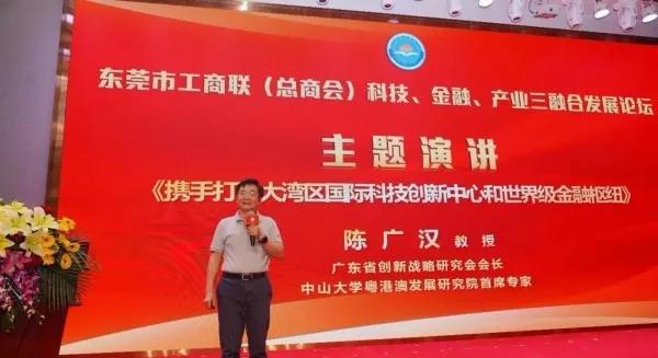 大會(huì)還邀請(qǐng)廣東省創(chuàng)新戰(zhàn)略研究會(huì)會(huì)長(zhǎng)、中山大學(xué)粵港澳發(fā)展研究院首席專家陳廣漢教授作了《攜手打造大灣區(qū)國(guó)際科技創(chuàng)新中心和世界級(jí)金融樞紐》主題演講。陳廣漢教授就東莞在參與粵港澳大灣區(qū)建設(shè)的過(guò)程中,在推動(dòng)科技、金融、產(chǎn)業(yè)“三融合”方面的機(jī)遇與主要努力方向進(jìn)行全方位解讀。