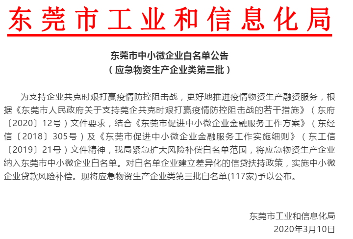 疫情防控期間,為了推動(dòng)企業(yè)順利復(fù)工復(fù)產(chǎn),東莞市陸續(xù)推出系列“暖企政策”,以“組合拳”的方式幫助企業(yè)解決復(fù)工復(fù)產(chǎn)中遇到的實(shí)際問(wèn)題。為全力支持和推動(dòng)新冠肺炎疫情防控物資和裝備生產(chǎn)企業(yè)復(fù)工復(fù)產(chǎn)、擴(kuò)大生產(chǎn),2020年2月27日,廣東省工業(yè)和信息化廳出臺(tái)了“支持新冠肺炎疫情防控物資和裝備生產(chǎn)企業(yè)擴(kuò)大生產(chǎn)的獎(jiǎng)勵(lì)政策”,支持疫情防控物資和裝備生產(chǎn)企業(yè)實(shí)施技術(shù)改造、擴(kuò)大生產(chǎn),獎(jiǎng)勵(lì)服從國(guó)家和省醫(yī)療防控物資調(diào)度要求的企業(yè)生產(chǎn)銷售。疫情防控啟動(dòng)以來(lái),為進(jìn)一步用好風(fēng)險(xiǎn)補(bǔ)償專項(xiàng)資金,東莞將應(yīng)急物資生產(chǎn)企業(yè)納入白名單。目前,東莞已將兩批共145家應(yīng)急物資生產(chǎn)企業(yè)納入白名單。