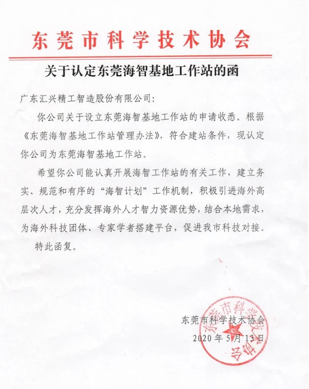 近日,東莞市科技協(xié)會公布了2020年度東莞海智基地工作站認定函,廣東匯興精工智造股份有限公司(簡稱:匯興智造)成功獲批!